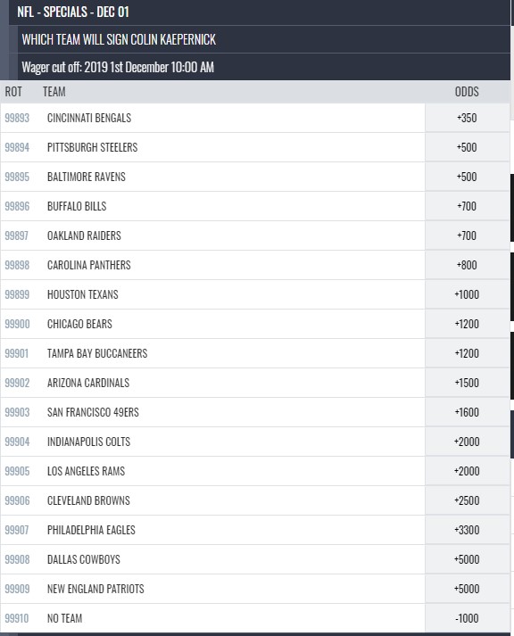 The Bengals are the only team in the NFL that has yet to record a victory this season. Under first-year head coach Zac Taylor the Bengals have been dismal. They’ve already benched long-time starter Andy Dalton and they’ve already begun preparing for the upcoming NFL Draft. This could lead to why Cincinnati is the favorite to sign Colin Kaepernick at +350 odds. Having an athletic and mobile quarterback would be a breath of fresh air for the Bengals offense. Signing Kaepernick would be an immediate upgrade over current starter Ryan Finley. Kaepernick would allow the franchise to remain competitive as they try to find their quarterback of the future.