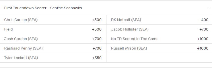 Tyler Lockett and D.K. Metcalf have been giving cornerbacks problems. Lockett is leading all receivers in receptions by 25, so Lockett scoring the Seahawks’ first touchdown (+350) would be a wager to take.