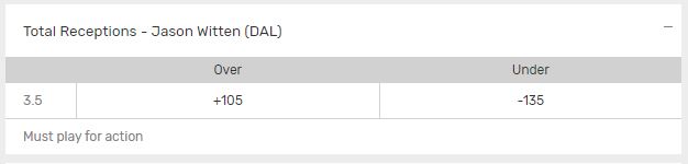 This will give Witten plenty of opportunities to find space in the middle of the field to help the Cowboys offense move the chains. Oddsmakers have the over/under set at 3.5 receptions for the veteran tight end with the over listed at +105 and the under listed at -135.